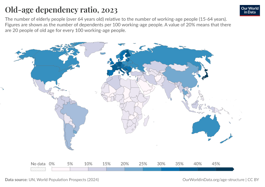 The old-age dependency ratio is almost a mirror image. Higher-income countries — particularly across Europe, North America, and East Asia — have the highest dependency ratios.