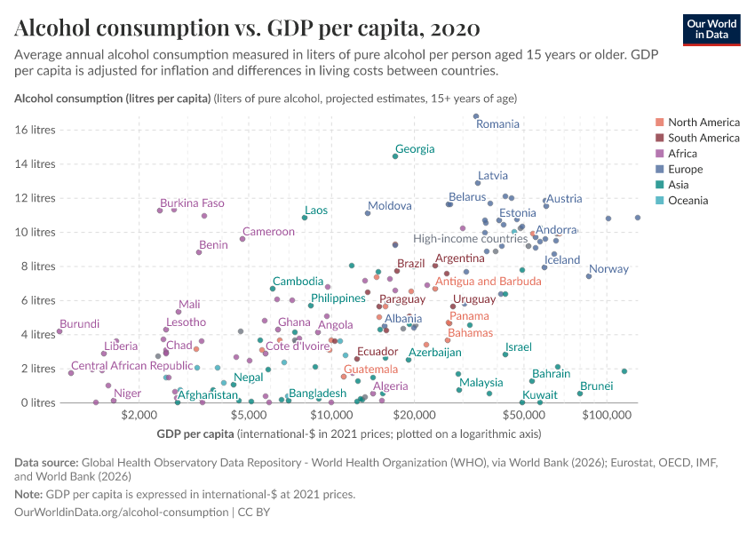 In the chart, we see the relationship between average per capita alcohol consumption – in liters of pure alcohol per year – versus gross domestic product (GDP) per capita across countries.
