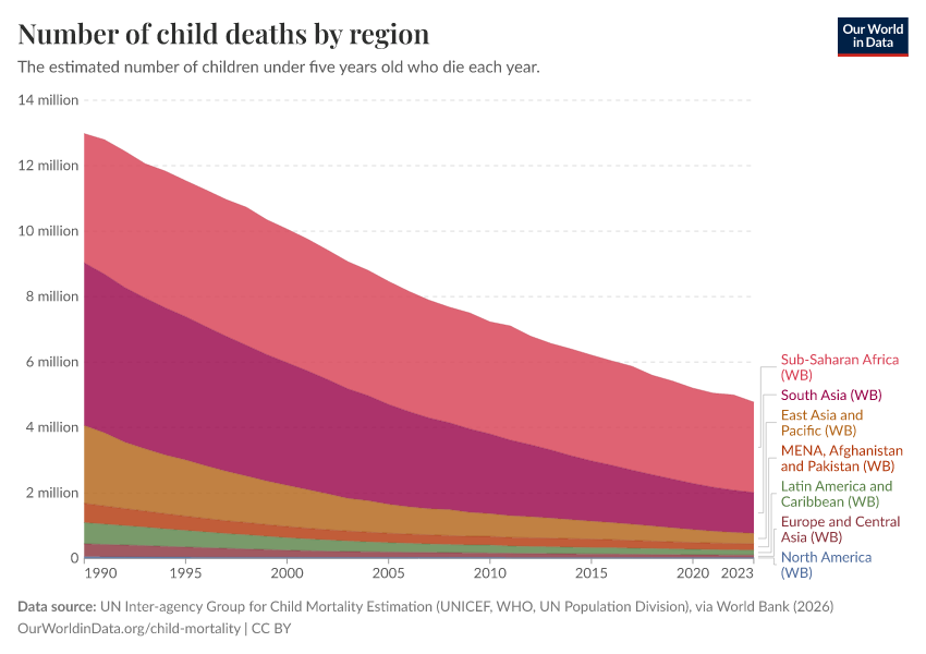 Saloni Dattani, Fiona Spooner, Hannah Ritchie, and Max Roser (2023) - “Child and Infant Mortality” Published online at OurWorldinData.org. Retrieved from: 'https://index-dataset-dim.owid.pages.dev/child-mortality' [Online Resource]BibTeX citation