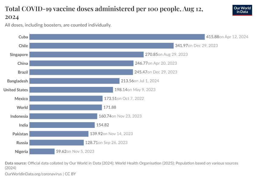 The following map and chart show the number of vaccine doses administered per 100 people within a given population. Each dose, including boosters, is counted as an individual dose.