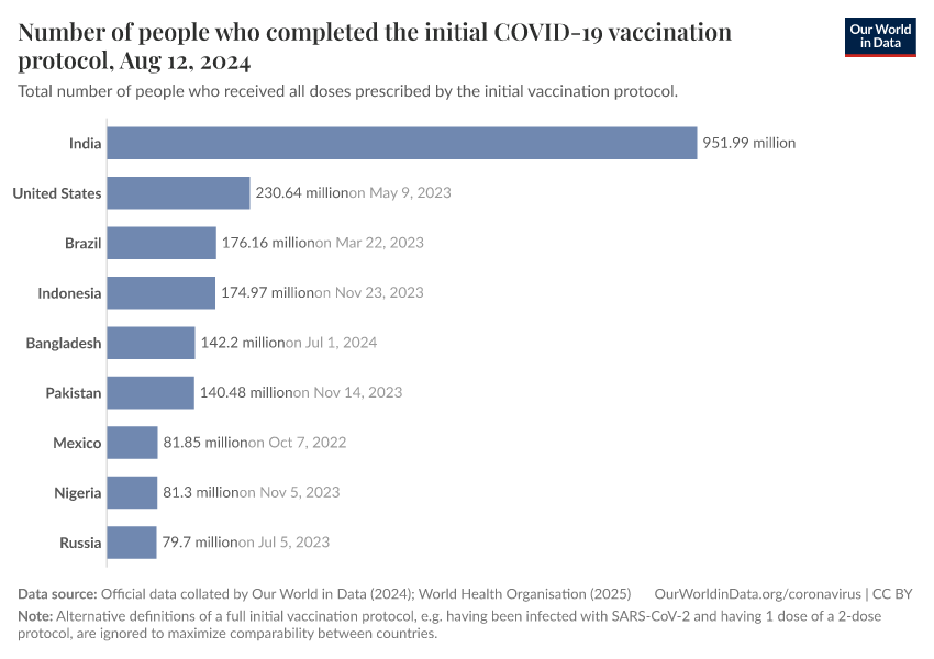 The following chart shows the share of the total population that has completed the initial vaccination protocol.