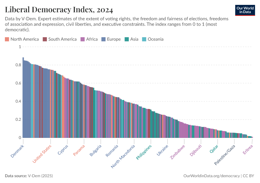 The source we show here is the electoral democracy index from the Varieties of Democracy (V-Dem) project1. In our Democracy Data Explorer, however, we show the data for several leading approaches, so that you can compare how different sources score democracy across the world.