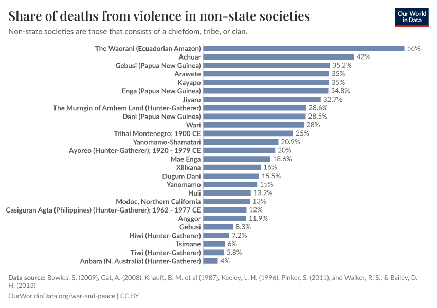 - Comment and Source that my source quotes: Gat (2006) quotes death rates from Pilling and Kimber and refers to three different sources: Warner, A Black Civilization, pp. 157–8; Pilling, in Man the Hunter, p. 158; R. G. Kimber, ‘Hunter-gatherer demography: The recent past in Central Australia’, in B. Meehan and N. White (eds), Hunter-Gatherer Demography. Sydney: University of Sydney, 1990, p. 163.Gat (2006) refers to Pilling saying: 'Pilling’s estimate of at least 10 per cent killed among the Tiwi men in one decade.'Gat (2006) refers to Kimber saying: 'Kimber’s estimate, for a generation, of 5 per cent mortality in fighting in arid areas and about 6.5 per cent in well-watered ones refers to violent mortality in relation to the entire population’s overall mortality rates.' Pinker quotes the 10%, which according to Gat (2006) only refers to the male population. I decided to quote the average of the two shares specified for the entire population. That is 5.75%.