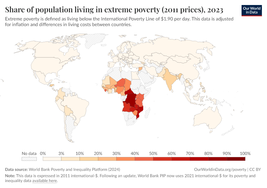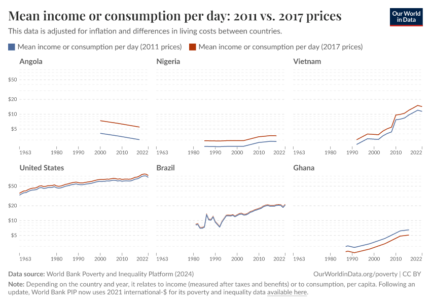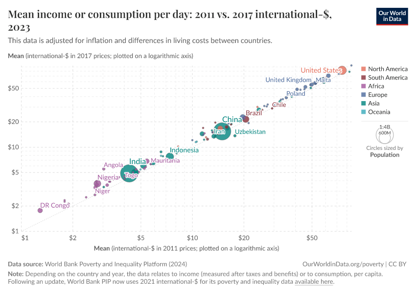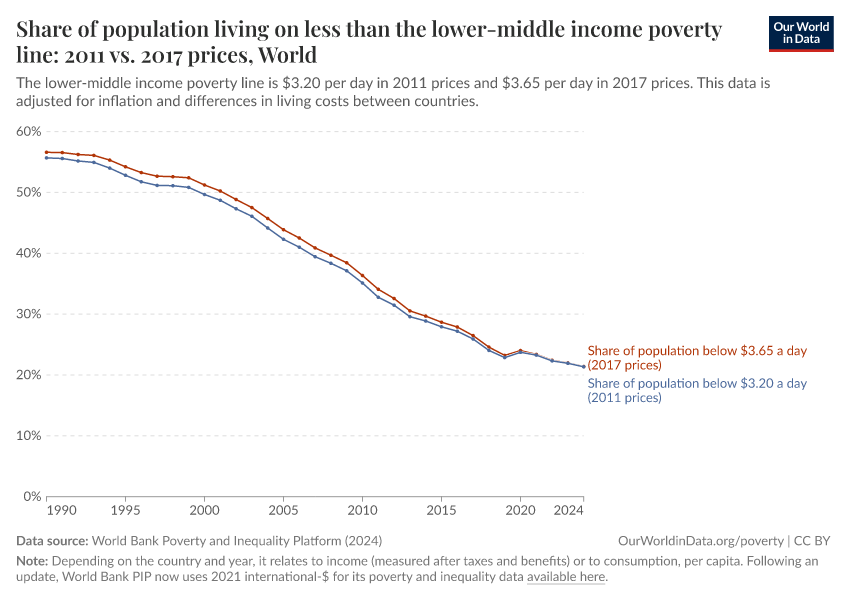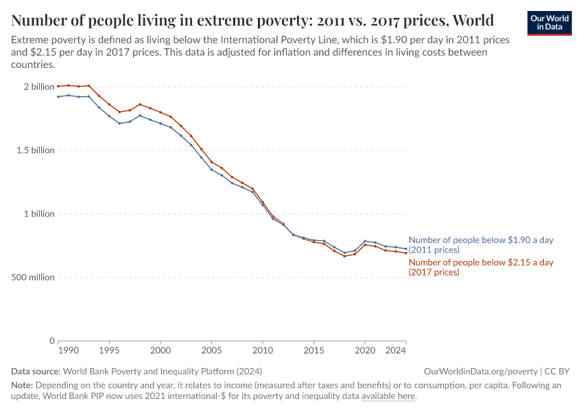 The World Bank has since updated its methods, and now measures incomes in 2021 international-$. As part of these changes, the International Poverty Line used to measure extreme poverty has also been updated: from $1.90 a day (in 2011 prices) to $2.15 a day (in 2017 prices) to $3 a day (in 2021 prices).