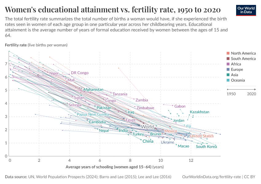 Have a look at Iran — in 1950, when Iranian women had on average only a third of a year of schooling, the fertility rate was around 7 children per woman. By 2020, when Iranian women had on average nine years of schooling, the fertility rate was below two (yes, the fertility rate in Iran is now similar to the figure in the US).