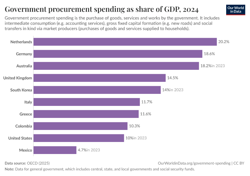 The chart shows the importance of public procurement in OECD countries (and partner countries providing comparable data). It shows the value of government spending on procurement as a share of GDP.