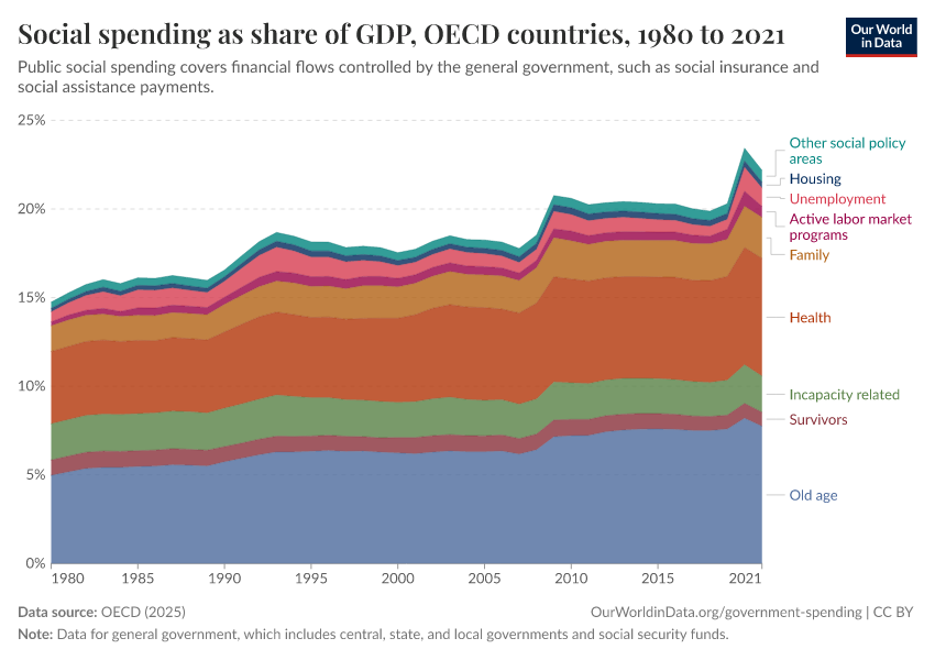 This data comes from the OECD Social Expenditure Database (SOCX). It includes what governments spend on social protection — as defined in the Classification of the Functions of Government (COFOG) — but also covers other areas that COFOG lists separately. The full list of social expenditures included is available in the OECD SOCX Manual.