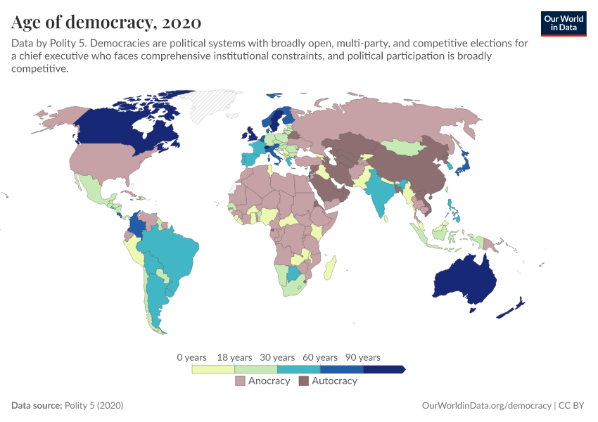 “Data Page: Age of democracy”, part of the following publication: Bastian Herre, Lucas Rodés-Guirao, and Esteban Ortiz-Ospina (2013) - “Democracy”. Data adapted from Polity 5. Retrieved from https://index-dataset-dim.owid.pages.dev/grapher/age-of-democracy-polity [online resource]How to cite this data