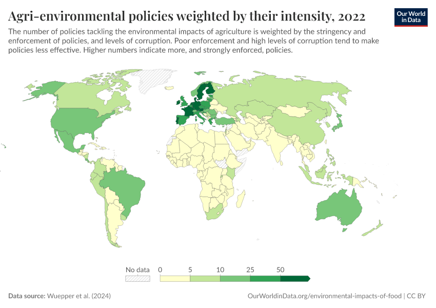 “Data Page: Agri-environmental policies weighted by their intensity”. Our World in Data (2026). Data adapted from Wuepper et al. (2024). Retrieved from https://index-dataset-dim.owid.pages.dev/grapher/agri-environmental-policies-intensity [online resource]How to cite this data