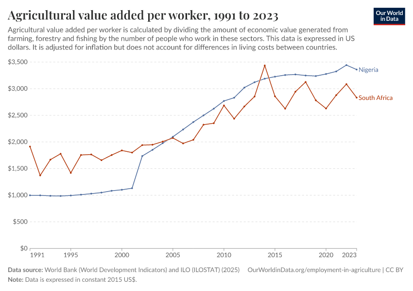 “Data Page: Agricultural value added per worker”. Our World in Data (2026). Data adapted from World Bank (World Development Indicators) and ILO (ILOSTAT). Retrieved from https://index-dataset-dim.owid.pages.dev/grapher/agriculture-value-added-per-worker-wdi [online resource]How to cite this data