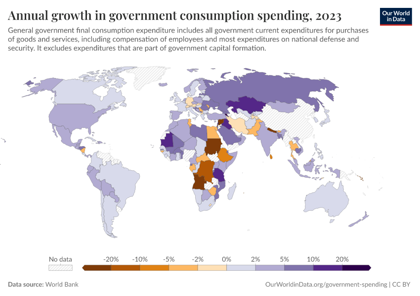 “Data Page: Annual growth in government consumption spending”. Our World in Data (2026). Data adapted from World Bank. Retrieved from https://index-dataset-dim.owid.pages.dev/grapher/annual-growth-of-general-government-final-consumption-expenditure [online resource]How to cite this data