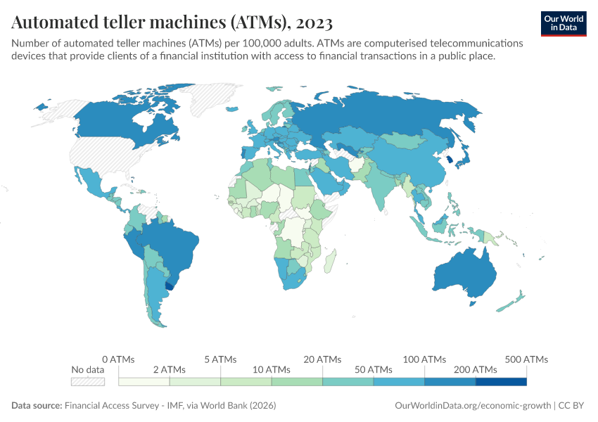 “Data Page: Automated teller machines (ATMs)”. Our World in Data (2026). Data adapted from Financial Access Survey - IMF, via World Bank. Retrieved from https://index-dataset-dim.owid.pages.dev/grapher/automated-teller-machines-atms-per-100000-adults [online resource]How to cite this data