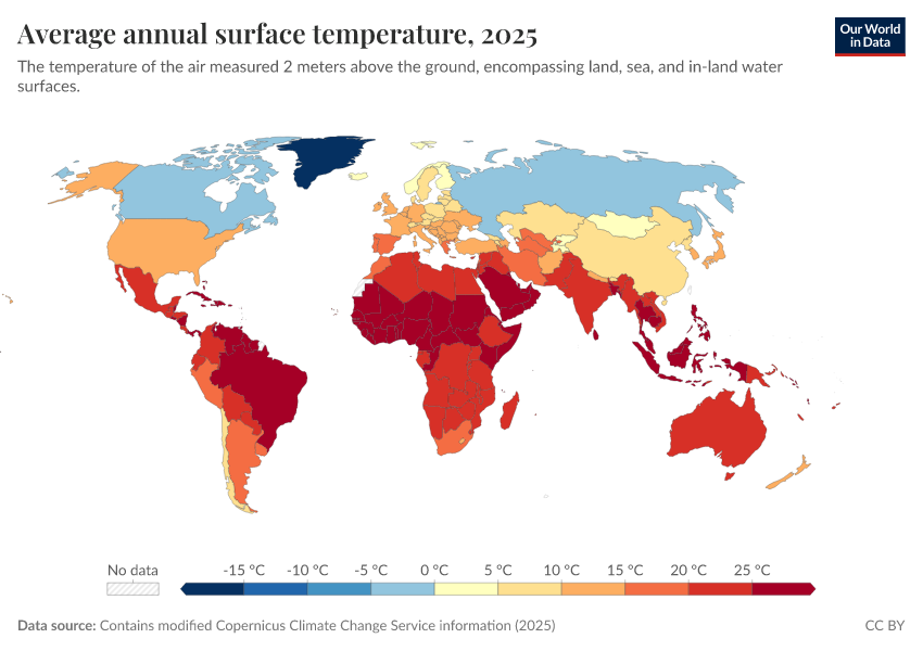 “Data Page: Average annual surface temperature”, part of the following publication: Hannah Ritchie, Pablo Rosado, and Veronika Samborska (2024) - “Climate Change”. Data adapted from Contains modified Copernicus Climate Change Service information. Retrieved from https://index-dataset-dim.owid.pages.dev/grapher/average-annual-surface-temperature [online resource]How to cite this data
