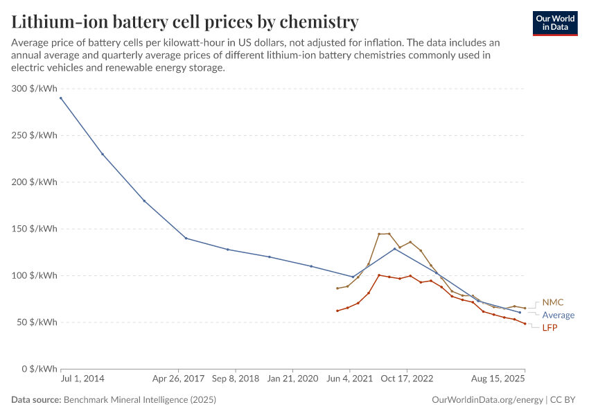 Benchmark Mineral Intelligence (2025) – with minor processing by Our World in Data. “Lithium-ion battery cell prices by chemistry” [dataset]. Benchmark Mineral Intelligence, “Lithium-ion battery prices”; Benchmark Mineral Intelligence, “Battery prices by chemistry” [original data]. Retrieved February 13, 2026 from https://index-dataset-dim.owid.pages.dev/grapher/average-battery-cell-price