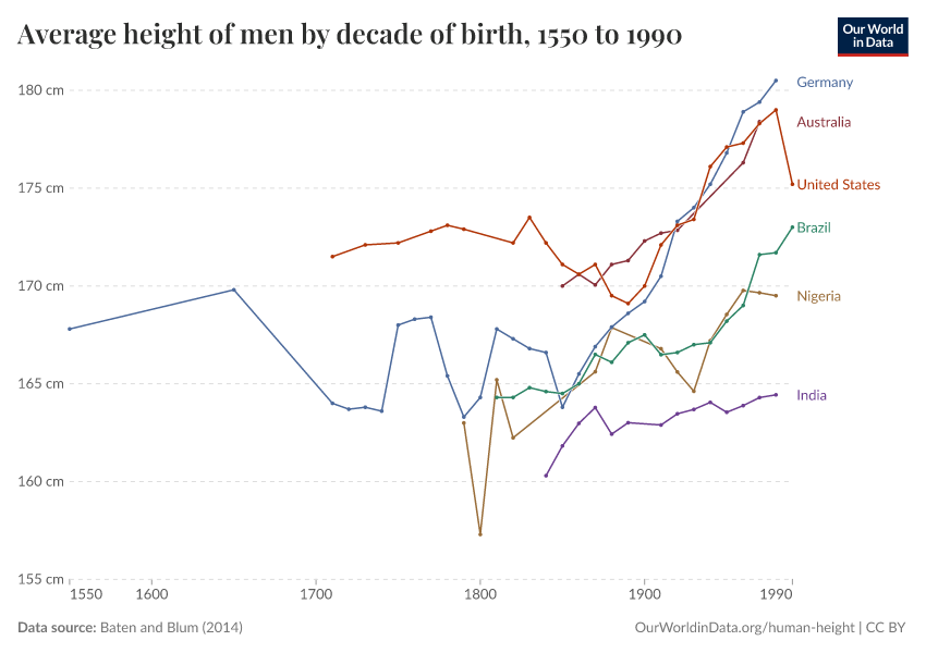 Baten and Blum (2014) – with minor processing by Our World in Data. “Average height of men by decade of birth” [dataset]. Baten and Blum, “Height” [original data]. Retrieved February 13, 2026 from https://index-dataset-dim.owid.pages.dev/grapher/average-height-of-men-for-selected-countries