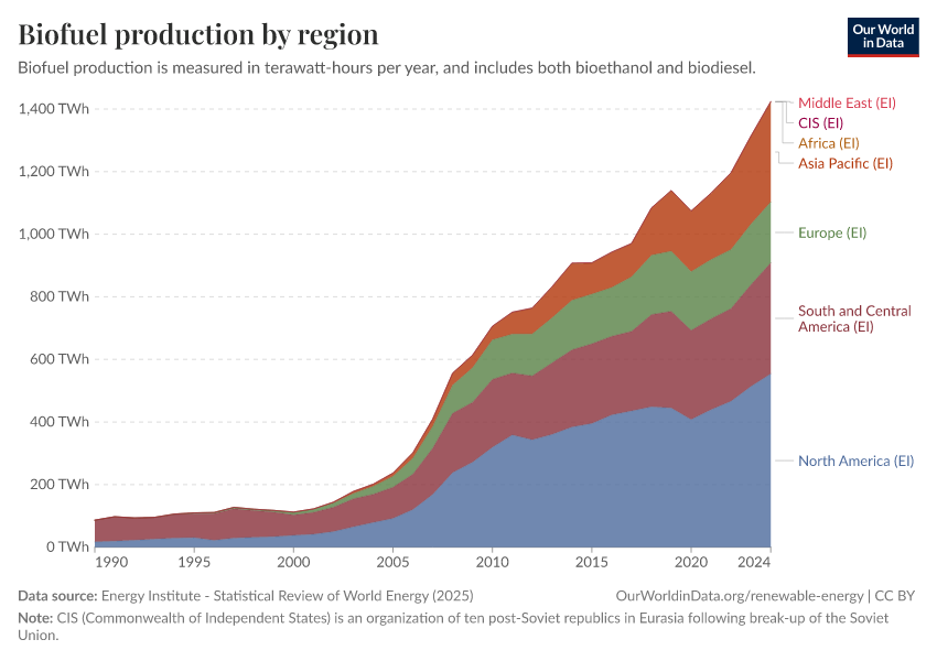Energy Institute - Statistical Review of World Energy (2025) – with major processing by Our World in Data. “Biofuels production” [dataset]. Energy Institute, “Statistical Review of World Energy” [original data]. Retrieved February 13, 2026 from https://index-dataset-dim.owid.pages.dev/grapher/biofuels-production-by-region