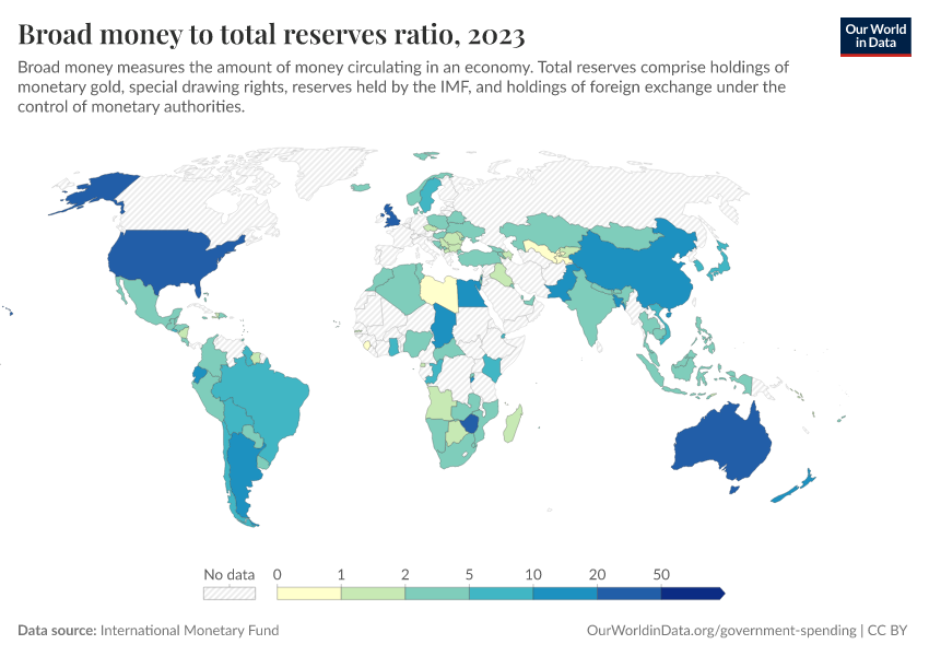 “Data Page: Broad money to total reserves ratio”. Our World in Data (2026). Data adapted from International Monetary Fund. Retrieved from https://index-dataset-dim.owid.pages.dev/grapher/broad-money-to-total-reserves-ratio [online resource]How to cite this data