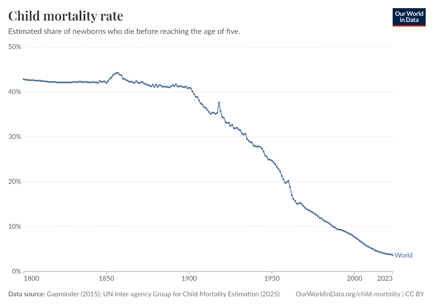 Gapminder (2015); UN Inter-agency Group for Child Mortality Estimation (2025) – processed by Our World in Data. “Child mortality rate – Gapminder; UN IGME – Long-run data” [dataset]. United Nations Inter-agency Group for Child Mortality Estimation, “United Nations Inter-agency Group for Child Mortality Estimation”; Gapminder, “Child mortality rate under age five v7”; Gapminder based on UN IGME & UN WPP, “Under-five Mortality v11”; Various sources, “Population” [original data]. Retrieved February 13, 2026 from https://index-dataset-dim.owid.pages.dev/grapher/child-mortality