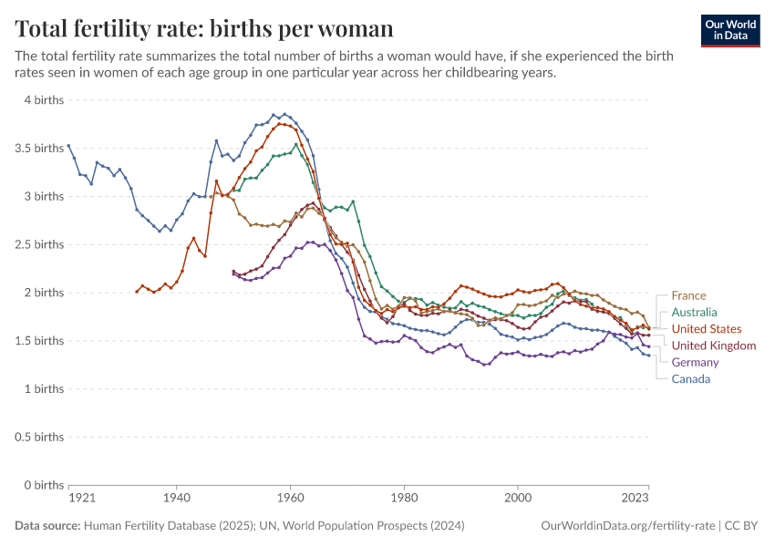 “Data Page: Fertility rate: births per woman”, part of the following publication: Saloni Dattani, Lucas Rodés-Guirao, and Max Roser (2025) - “Fertility Rate”. Data adapted from Human Fertility Database, United Nations. Retrieved from https://index-dataset-dim.owid.pages.dev/grapher/children-born-per-woman [online resource]How to cite this data