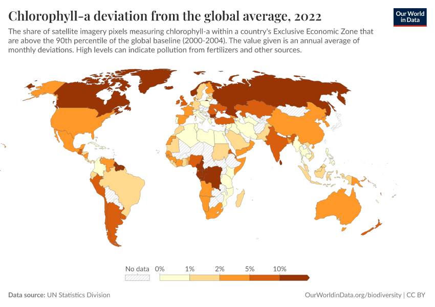 UN Statistics Division – processed by Our World in Data. “Chlorophyll-a deviation from the global average” [dataset]. UN Statistics Division, “World Environment Situation Room” [original data]. Retrieved February 13, 2026 from https://index-dataset-dim.owid.pages.dev/grapher/chlorophyll-a-deviation-from-the-global-average