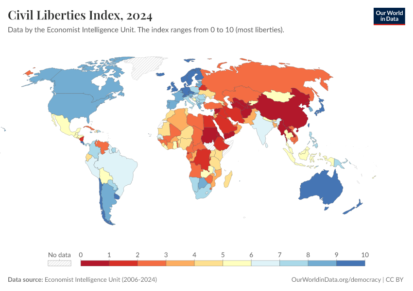 Economist Intelligence Unit (2006-2024) – processed by Our World in Data. “Civil Liberties Index” [dataset]. Economist Intelligence Unit, “Democracy Index 2021: The China challenge”; Economist Intelligence Unit, “Democracy Index 2022: Frontline democracy and the battle for Ukraine”; Economist Intelligence Unit, “Democracy Index 2023: Age of Conflict”; Economist Intelligence Unit, “Democracy Index 2024: What's wrong with representative democracy?”; Gapminder, “Democracy Index v4”; Various sources, “Population” [original data]. Retrieved February 13, 2026 from https://index-dataset-dim.owid.pages.dev/grapher/civil-liberties-index-eiu
