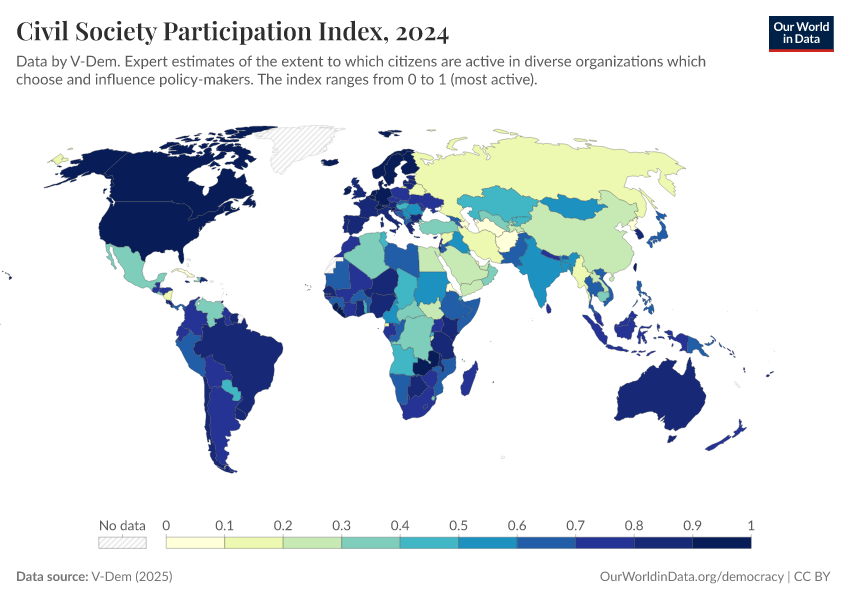 “Data Page: Civil society participation index”, part of the following publication: Bastian Herre, Lucas Rodés-Guirao, and Esteban Ortiz-Ospina (2013) - “Democracy”. Data adapted from V-Dem. Retrieved from https://index-dataset-dim.owid.pages.dev/grapher/civil-society-participation-index [online resource]How to cite this data