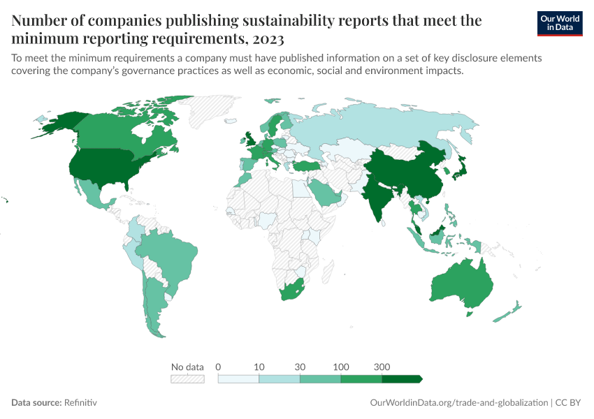 “Data Page: Number of companies publishing sustainability reports that meet the minimum reporting requirements”. Our World in Data (2026). Data adapted from Refinitiv. Retrieved from https://index-dataset-dim.owid.pages.dev/grapher/companies-publishing-sustainability-reports-minimum-requirements [online resource]How to cite this data