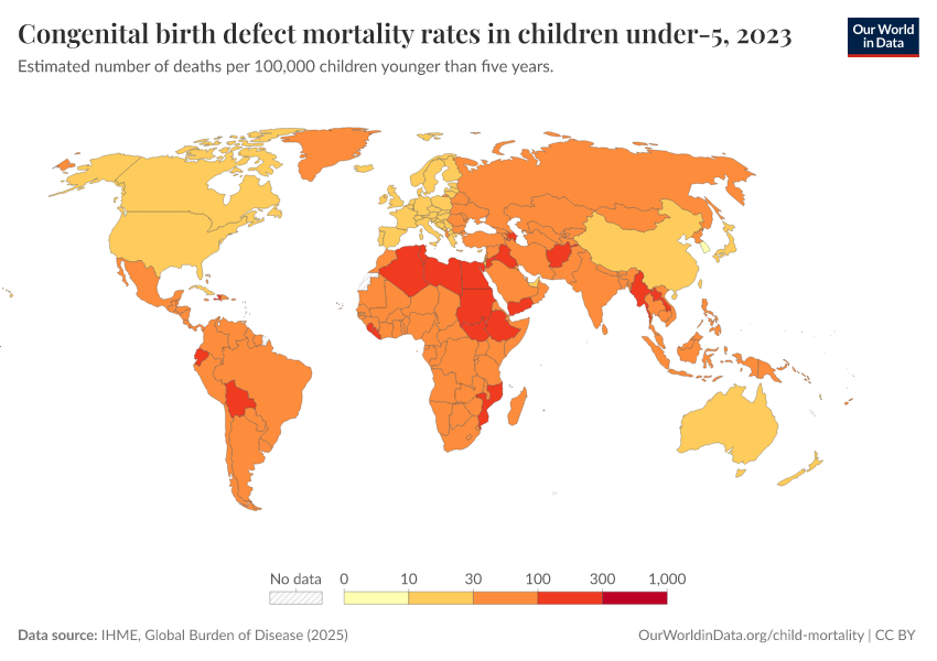 IHME, Global Burden of Disease (2024) – with minor processing by Our World in Data. “Congenital birth defect mortality rates in children under-5” [dataset]. IHME, Global Burden of Disease, “Global Burden of Disease - Deaths and DALYs” [original data]. Retrieved February 13, 2026 from https://index-dataset-dim.owid.pages.dev/grapher/congenital-birth-defect-mortality-rates-in-children-under-5