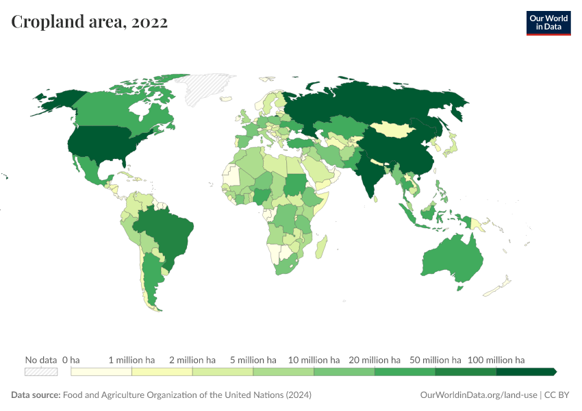 “Data Page: Cropland area”, part of the following publication: Hannah Ritchie, Pablo Rosado, and Max Roser (2023) - “Agricultural Production”. Data adapted from Food and Agriculture Organization of the United Nations. Retrieved from https://index-dataset-dim.owid.pages.dev/grapher/cropland-area [online resource]