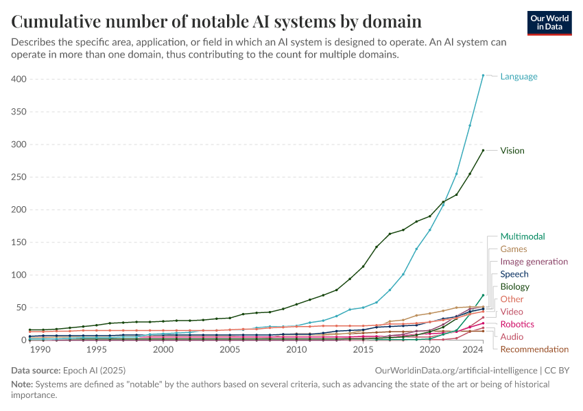 Epoch AI (2025) – with major processing by Our World in Data. “Cumulative number of notable AI systems by domain” [dataset]. Epoch AI, “Parameter, Compute and Data Trends in Machine Learning” [original data]. Retrieved February 13, 2026 from https://index-dataset-dim.owid.pages.dev/grapher/cumulative-number-of-notable-ai-systems-by-domain