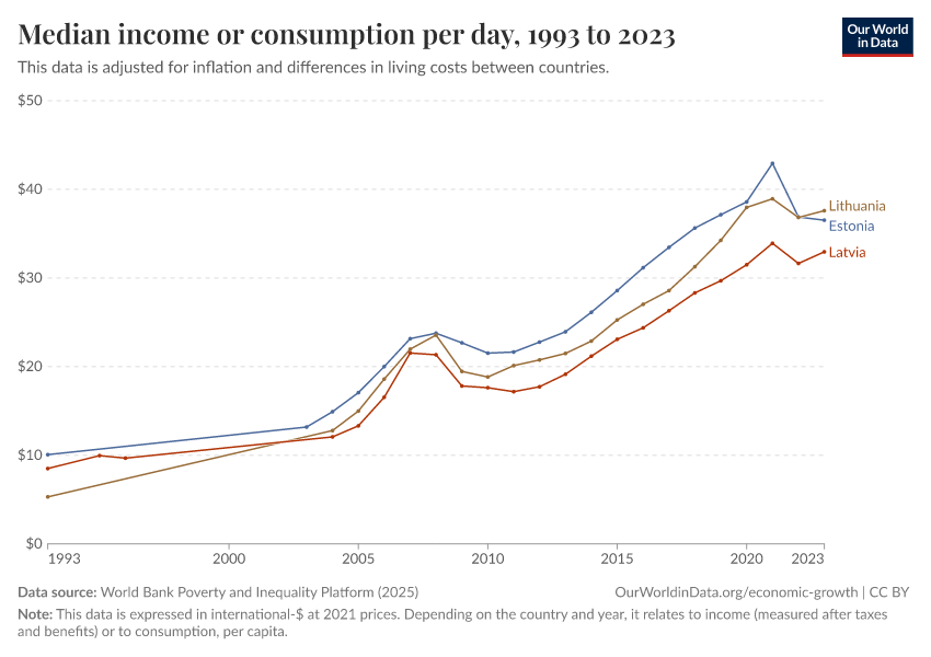 World Bank Poverty and Inequality Platform (2025) – with major processing by Our World in Data. “Median income or consumption per day – World Bank” [dataset]. World Bank Poverty and Inequality Platform, “World Bank Poverty and Inequality Platform (PIP) 20250930_2021, 20250930_2017” [original data]. Retrieved February 13, 2026 from https://index-dataset-dim.owid.pages.dev/grapher/daily-median-income