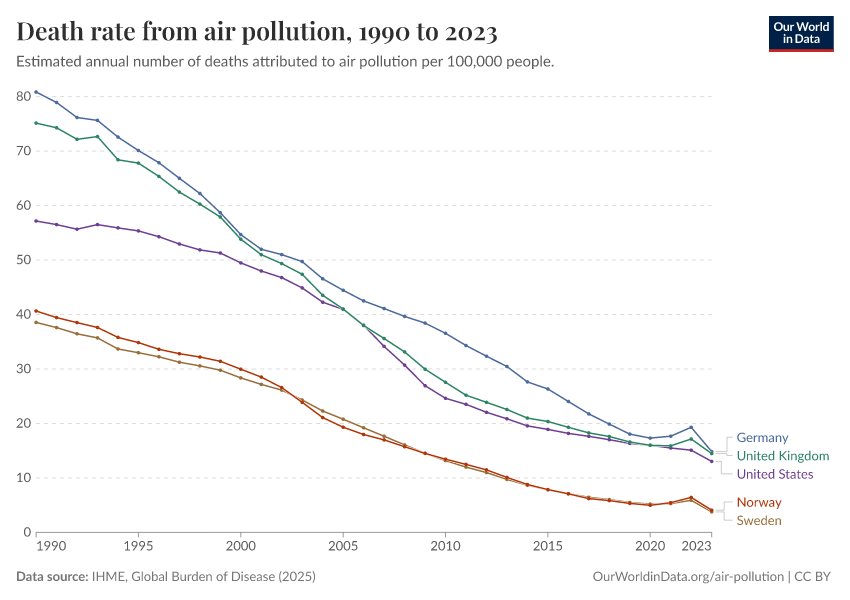 IHME, Global Burden of Disease (2024) – with minor processing by Our World in Data. “Death rate from air pollution” [dataset]. IHME, Global Burden of Disease, “Global Burden of Disease - Risk Factors” [original data]. Retrieved February 13, 2026 from https://index-dataset-dim.owid.pages.dev/grapher/death-rate-from-air-pollution-per-100000