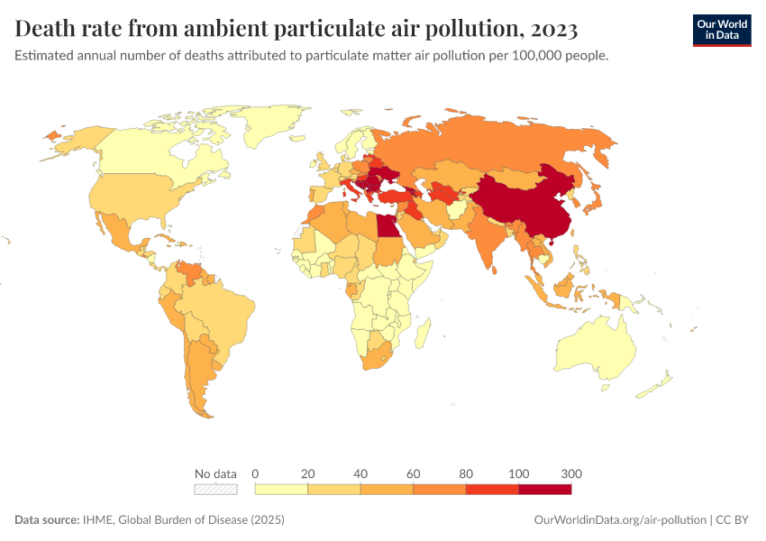 IHME, Global Burden of Disease (2024) – with minor processing by Our World in Data. “Death rate from ambient particulate air pollution” [dataset]. IHME, Global Burden of Disease, “Global Burden of Disease - Risk Factors” [original data]. Retrieved February 13, 2026 from https://index-dataset-dim.owid.pages.dev/grapher/death-rate-from-ambient-particulate-air-pollution