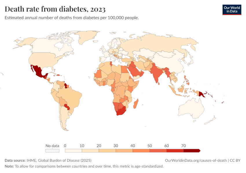 IHME, Global Burden of Disease (2024) – with minor processing by Our World in Data. “Death rate from diabetes” [dataset]. IHME, Global Burden of Disease, “Global Burden of Disease - Deaths and DALYs” [original data]. Retrieved February 13, 2026 from https://index-dataset-dim.owid.pages.dev/grapher/death-rate-from-diabetes