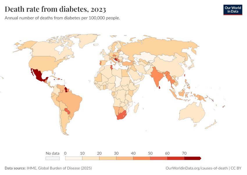 “Data Page: Death rate from diabetes”, part of the following publication: Esteban Ortiz-Ospina and Max Roser (2016) - “Global Health”. Data adapted from IHME, Global Burden of Disease. Retrieved from https://index-dataset-dim.owid.pages.dev/grapher/death-rate-from-diabetes-gbd [online resource]How to cite this data