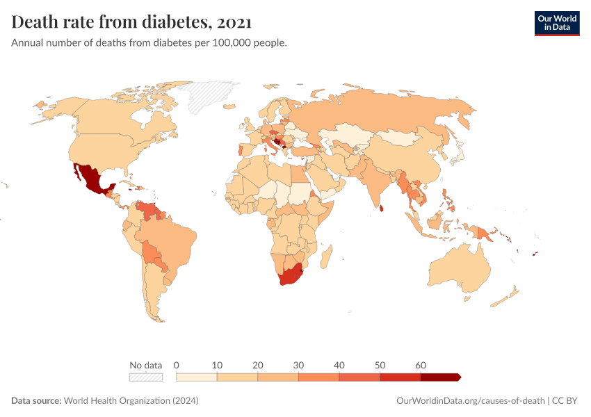 “Data Page: Death rate from diabetes”, part of the following publication: Esteban Ortiz-Ospina and Max Roser (2016) - “Global Health”. Data adapted from World Health Organization. Retrieved from https://index-dataset-dim.owid.pages.dev/grapher/death-rate-from-diabetes-ghe [online resource]How to cite this data