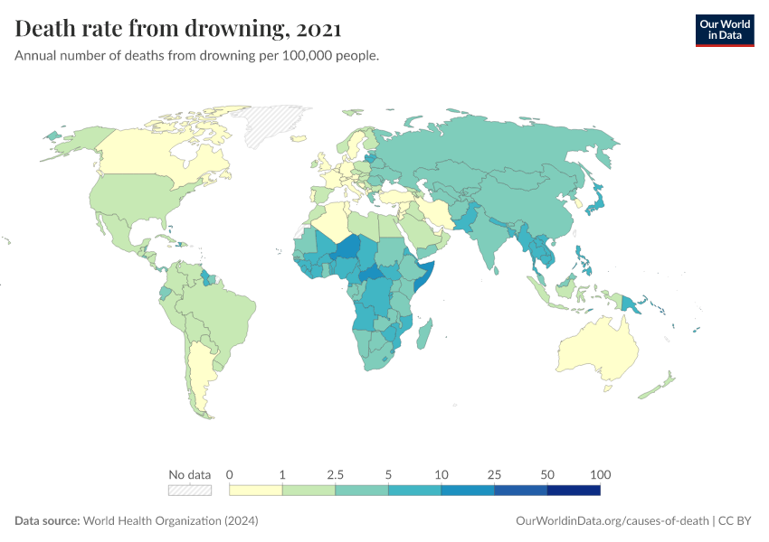 “Data Page: Death rate from drowning”, part of the following publication: Esteban Ortiz-Ospina and Max Roser (2016) - “Global Health”. Data adapted from World Health Organization. Retrieved from https://index-dataset-dim.owid.pages.dev/grapher/death-rate-from-drowning-ghe [online resource]How to cite this data