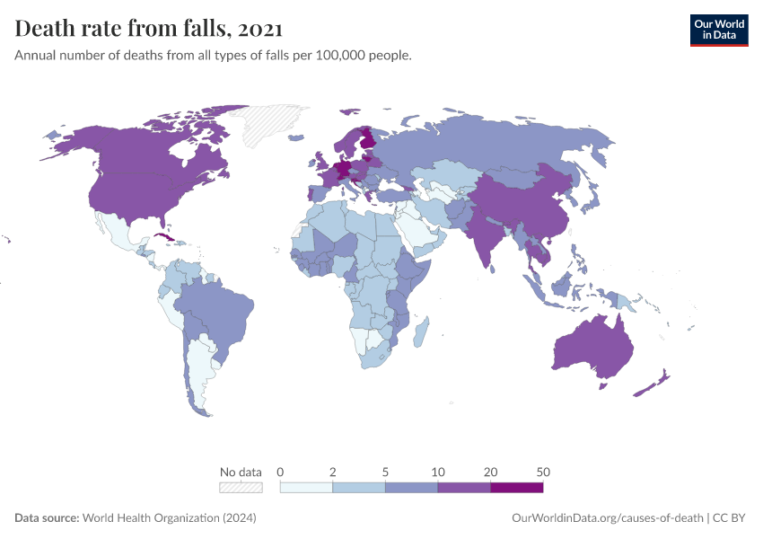 “Data Page: Death rate from falls”, part of the following publication: Esteban Ortiz-Ospina and Max Roser (2016) - “Global Health”. Data adapted from World Health Organization. Retrieved from https://index-dataset-dim.owid.pages.dev/grapher/death-rate-from-falls [online resource]How to cite this data