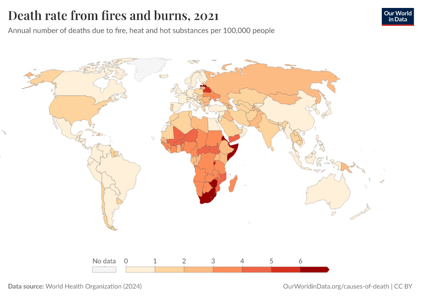 World Health Organization (2024) – with major processing by Our World in Data. “Death rate from fires and burns” [dataset]. World Health Organization, “Global Health Estimates” [original data]. Retrieved February 13, 2026 from https://index-dataset-dim.owid.pages.dev/grapher/death-rate-from-fires-and-burns-who