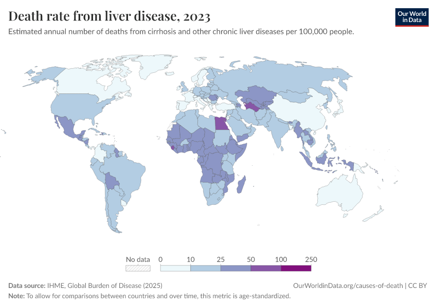 IHME, Global Burden of Disease (2024) – with minor processing by Our World in Data. “Death rate from liver disease” [dataset]. IHME, Global Burden of Disease, “Global Burden of Disease - Deaths and DALYs” [original data]. Retrieved February 13, 2026 from https://index-dataset-dim.owid.pages.dev/grapher/death-rate-from-liver-disease