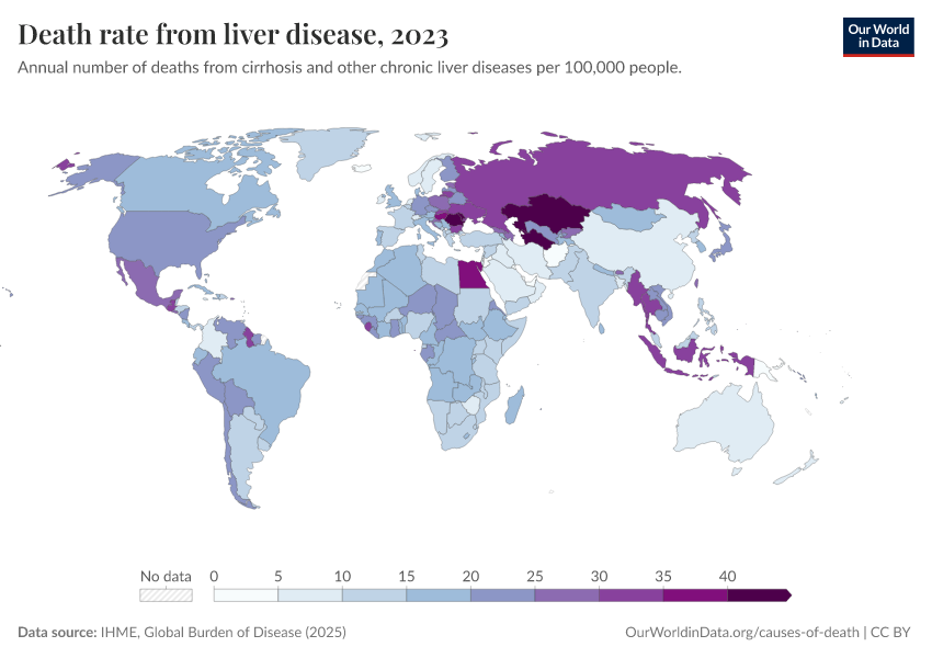 IHME, Global Burden of Disease (2024) – with minor processing by Our World in Data. “Death rate from liver disease” [dataset]. IHME, Global Burden of Disease, “Global Burden of Disease - Deaths and DALYs” [original data]. Retrieved February 13, 2026 from https://index-dataset-dim.owid.pages.dev/grapher/death-rate-from-liver-disease-gbd