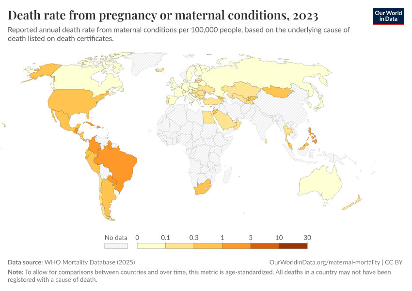 WHO Mortality Database (2025) – with minor processing by Our World in Data. “Death rate from pregnancy or maternal conditions” [dataset]. WHO Mortality Database, “WHO Mortality Database” [original data]. Retrieved February 13, 2026 from https://index-dataset-dim.owid.pages.dev/grapher/death-rate-from-maternal-disorders