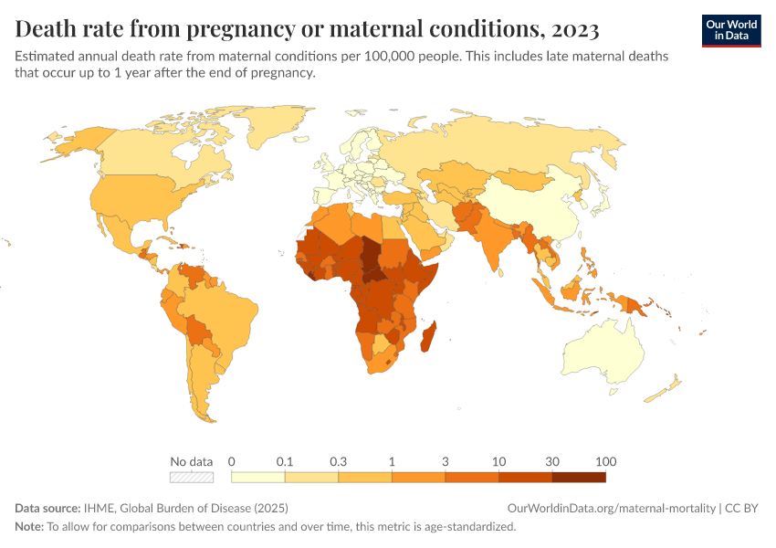 IHME, Global Burden of Disease (2024) – with minor processing by Our World in Data. “Death rate from pregnancy or maternal conditions” [dataset]. IHME, Global Burden of Disease, “Global Burden of Disease - Deaths and DALYs” [original data]. Retrieved February 13, 2026 from https://index-dataset-dim.owid.pages.dev/grapher/death-rate-from-maternal-disorders-ihme