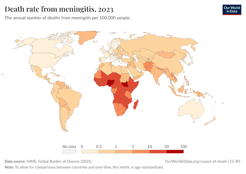 IHME, Global Burden of Disease (2024) – with minor processing by Our World in Data. “Death rate from meningitis” [dataset]. IHME, Global Burden of Disease, “Global Burden of Disease - Deaths and DALYs” [original data]. Retrieved February 13, 2026 from https://index-dataset-dim.owid.pages.dev/grapher/death-rate-from-meningitis