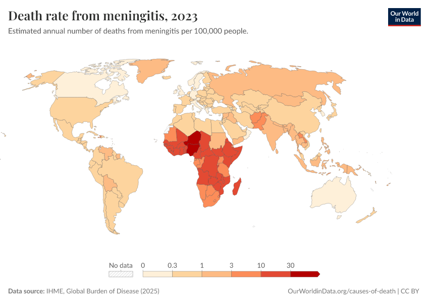 “Data Page: Death rate from meningitis”, part of the following publication: Esteban Ortiz-Ospina and Max Roser (2016) - “Global Health”. Data adapted from IHME, Global Burden of Disease. Retrieved from https://index-dataset-dim.owid.pages.dev/grapher/death-rate-from-meningitis-gbd [online resource]How to cite this data