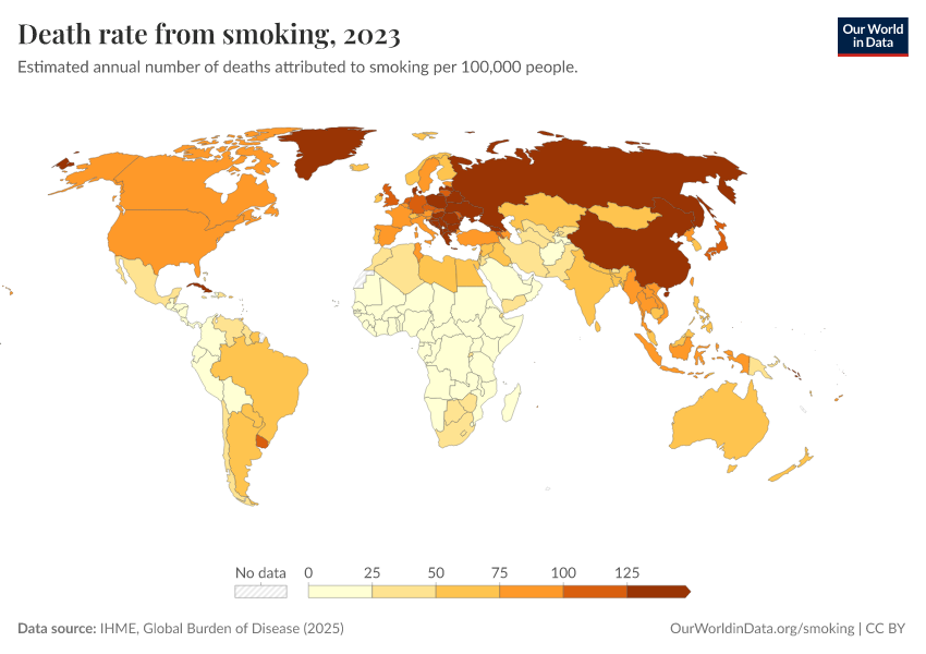 IHME, Global Burden of Disease (2024) – with minor processing by Our World in Data. “Death rate from smoking” [dataset]. IHME, Global Burden of Disease, “Global Burden of Disease - Risk Factors” [original data]. Retrieved February 13, 2026 from https://index-dataset-dim.owid.pages.dev/grapher/death-rate-from-smoking