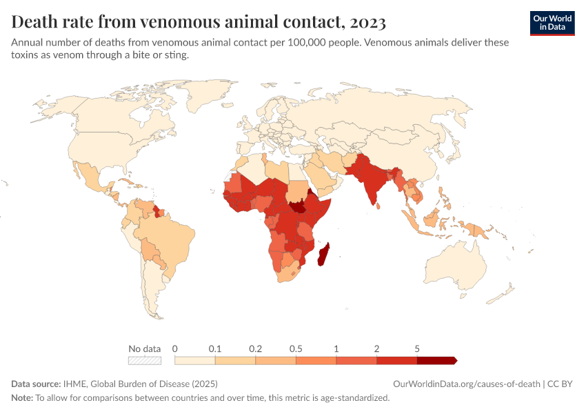 IHME, Global Burden of Disease (2024) – with minor processing by Our World in Data. “Death rate from venomous animal contact” [dataset]. IHME, Global Burden of Disease, “Global Burden of Disease - Deaths and DALYs” [original data]. Retrieved February 13, 2026 from https://index-dataset-dim.owid.pages.dev/grapher/death-rate-from-venomous-animal