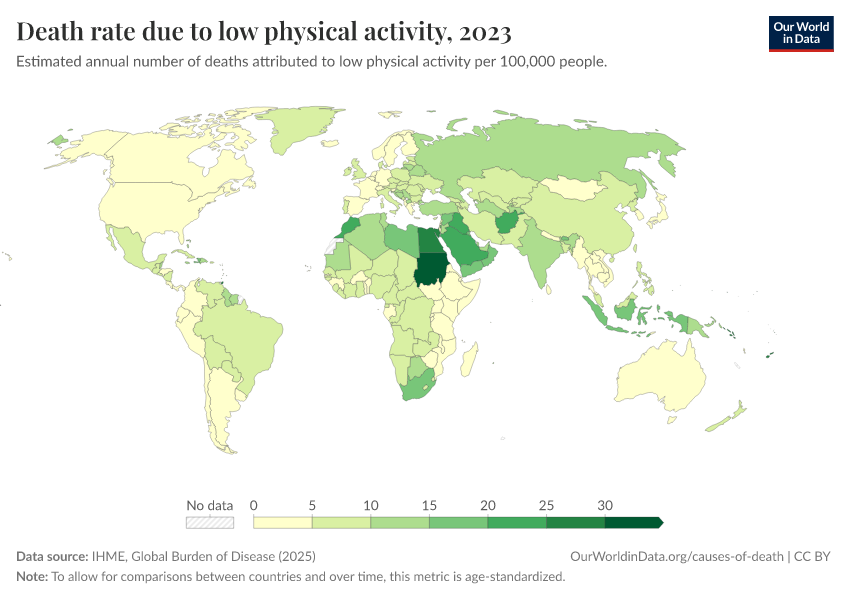 “Data Page: Death rate due to low physical activity”, part of the following publication: Esteban Ortiz-Ospina and Max Roser (2016) - “Global Health”. Data adapted from IHME, Global Burden of Disease. Retrieved from https://index-dataset-dim.owid.pages.dev/grapher/death-rates-due-to-low-physical-activity [online resource]How to cite this data