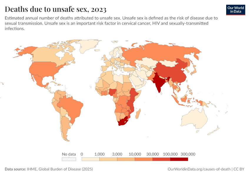 IHME, Global Burden of Disease (2024) – with minor processing by Our World in Data. “Deaths due to unsafe sex” [dataset]. IHME, Global Burden of Disease, “Global Burden of Disease - Risk Factors” [original data]. Retrieved February 13, 2026 from https://index-dataset-dim.owid.pages.dev/grapher/deaths-due-to-unsafe-sex