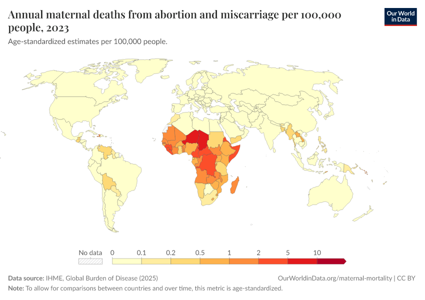 IHME, Global Burden of Disease (2024) – with minor processing by Our World in Data. “Annual maternal deaths from abortion and miscarriage per 100,000 people” [dataset]. IHME, Global Burden of Disease, “Global Burden of Disease - Deaths and DALYs” [original data]. Retrieved February 13, 2026 from https://index-dataset-dim.owid.pages.dev/grapher/deaths-from-abortion-and-miscarriage-per-100000-people